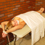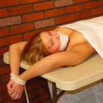 Christina is a well-known model and actress and she has somehow ended up facing peril here in the Nasty Center. We experimented on her with a new polymer cloth that shrinks slowly as it is heated. She was held down to the table with a noose and rope on her ankles. The results of our test are still being analyzed.... |